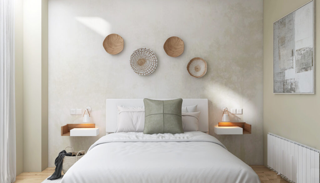 Las mesitas de noche son de roble natural y lacado en blanco. Como decoración vertical, se optó por un cuadro de dimensiones 90×90 cm y platos de madera natural decorados, que combinan a la perfección con el resto de mobiliario y accesorios decorativos.